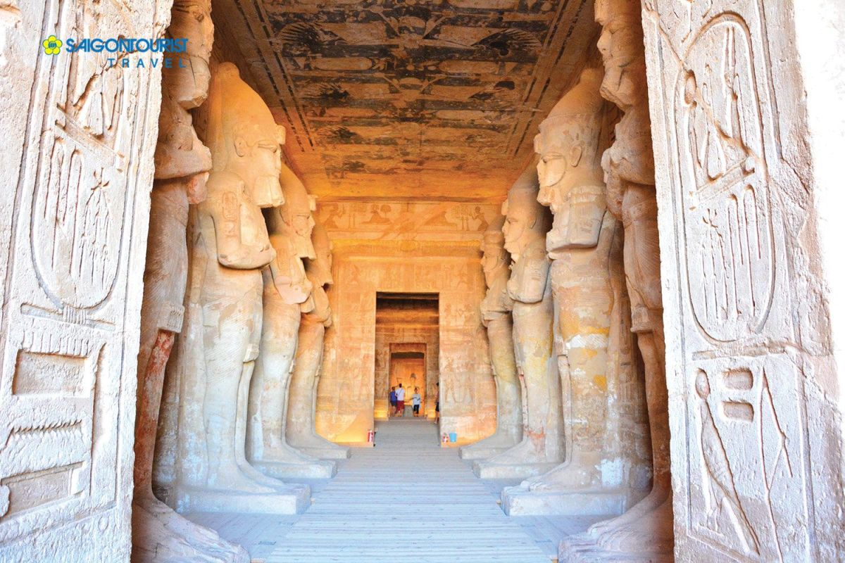 Bên trong đền Abu Simbell (Ai Cập) với hành lang là nơi các pho tượng thần Osiris khổng lồ trấn giữ