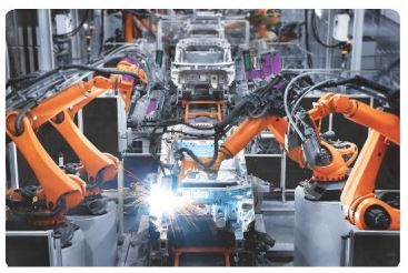 Các cánh tay rô-bốt đang làm việc trong dây chuyền sản xuất, lắp ráp ô tô
